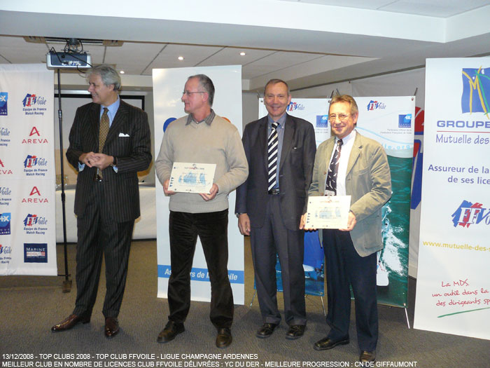 Daniel Laurent, notre Président, reçoit pour le Yachting Club du Der, le prix du club de la Ligue 19 (Champagne-Ardenne) ayant le plus grand nombre de licenciés en 2008. Bravo également au CNG et à son président, Jean-Paul Tisserand, il a reçu le prix du club de la ligue 19 ayant la plus grosse progression de licenciés en 2008.