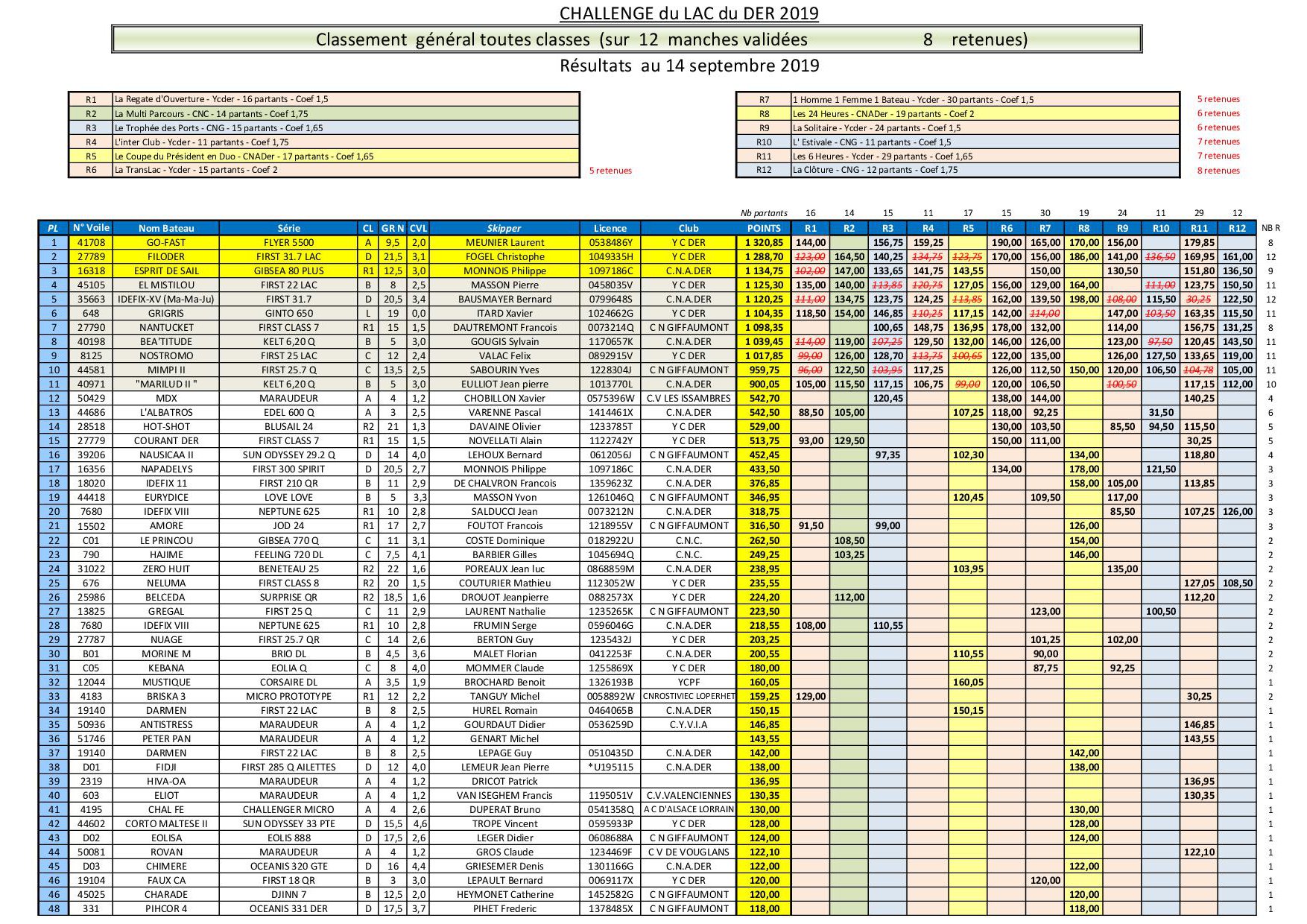 Résultats au 14 septembre 2019 : 12 manches validées (8 manches retenues)